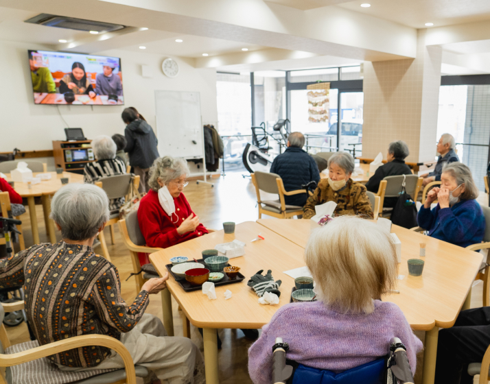 デイサービスは、朝、夕にご自宅へ送迎させていただき、施設にて入浴、食事、趣味活動等、ごゆっくりお過ごしいただきます。